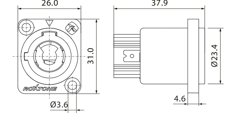 Панельный силовой разъём Roxtone RAC3MPI-WP Brown, PowerCon, 20 А, 250 В. Соответствует стандарту UL V-0.