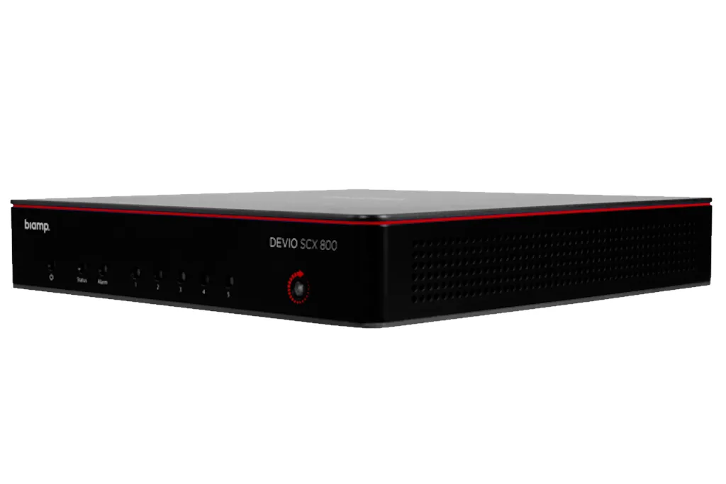 Аудиопроцессор Biamp Devio SCX-800 — хаб для конференц-залов. Поддерживает подключение через USB к Biamp Modena и системам Unified Communications. Оснащён интерфейсами SIP VoIP и пятью гигабитными портами Ethernet (4 с PoE). Имеет функцию Biamp Launch для быстрой настройки. Управление через веб-интерфейс и SageVue. Возможна установка на поверхность с помощью кронштейна.
