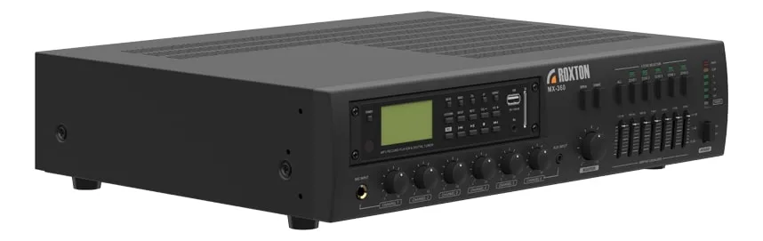 Микшер-усилитель ROXTON MX-360 имеет шесть микрофонных или линейных входов с Phone, XLR и RCA разъёмами. Устройство поддерживает RJ-45 для подключения микрофонных консолей и евро разъём для АТС. Оснащено фантомным питанием, 7-полосным эквалайзером и системой защиты от перегрева. Мощность — 360 Вт.