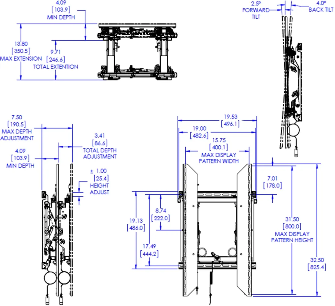 Выдвижной кронштейн CHIEF LVS1UP для телевизоров 42–80 дюймов. Есть микрорегулировки по высоте, горизонтали, вертикали и параллельности. Выдерживает до 68 кг, минимальная глубина от стены — 10 см. Монтажные отверстия до 800х400 мм.