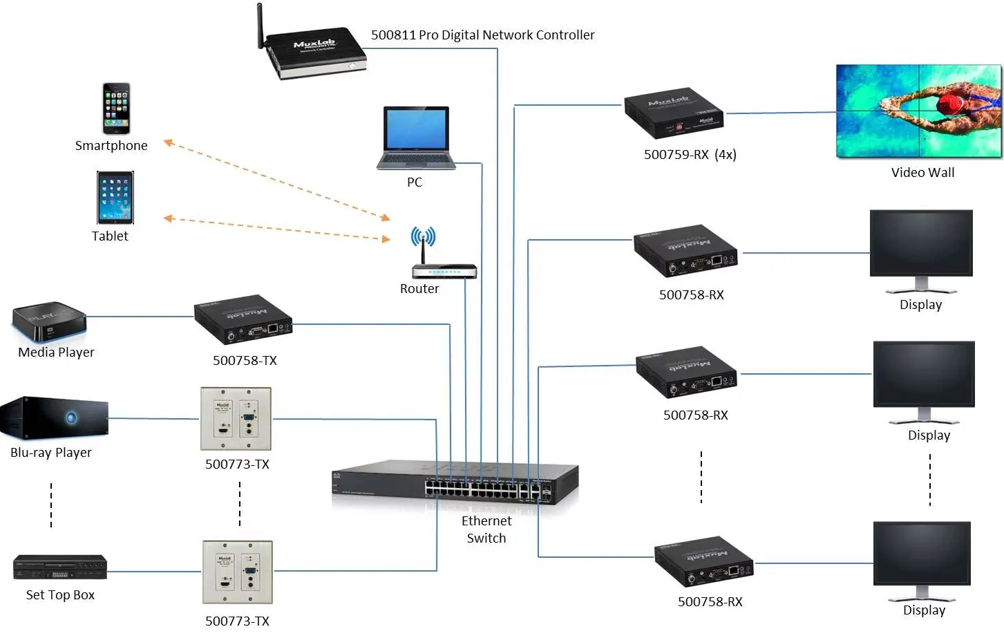 Описание настенного передатчикаНастенный передатчик MuxLab — компактное устройство для передачи сигналов HDMI и VGA на расстояние до 100 метров через Ethernet-кабель Cat5e/6. Поддерживает разрешение до 4K (3840×2160) при 30 Гц для HDMI и 1920×1200 при 60 Гц для VGA. Имеет 2-канальный аудиовход и позволяет выбирать вход локально или удалённо. Устройство поддерживает автоматическое и ручное переключение с LED-индикаторами. Подходит для коммерческих и бытовых систем, классных комнат, цифровых вывесок и медицинских информационных систем.