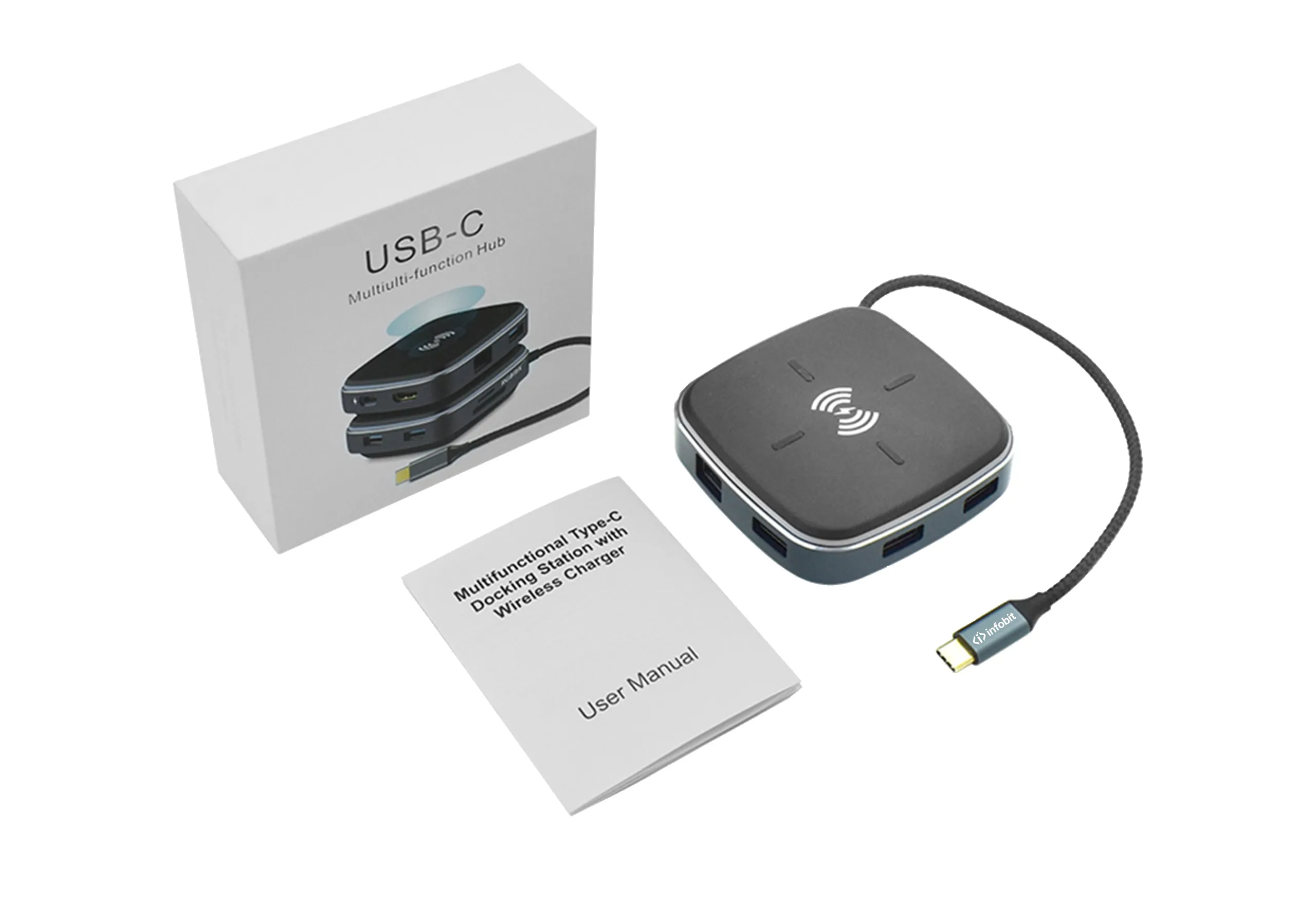 Краткое описание Infobit iHub 901WInfobit iHub 901W — это USB-C хаб с 9 портами, включая беспроводную зарядку Qi. Он подходит для устройств с портом USB-C и позволяет подключать периферийные устройства, дисплеи и сети через один кабель. Хаб поддерживает технологию plug-and-play.