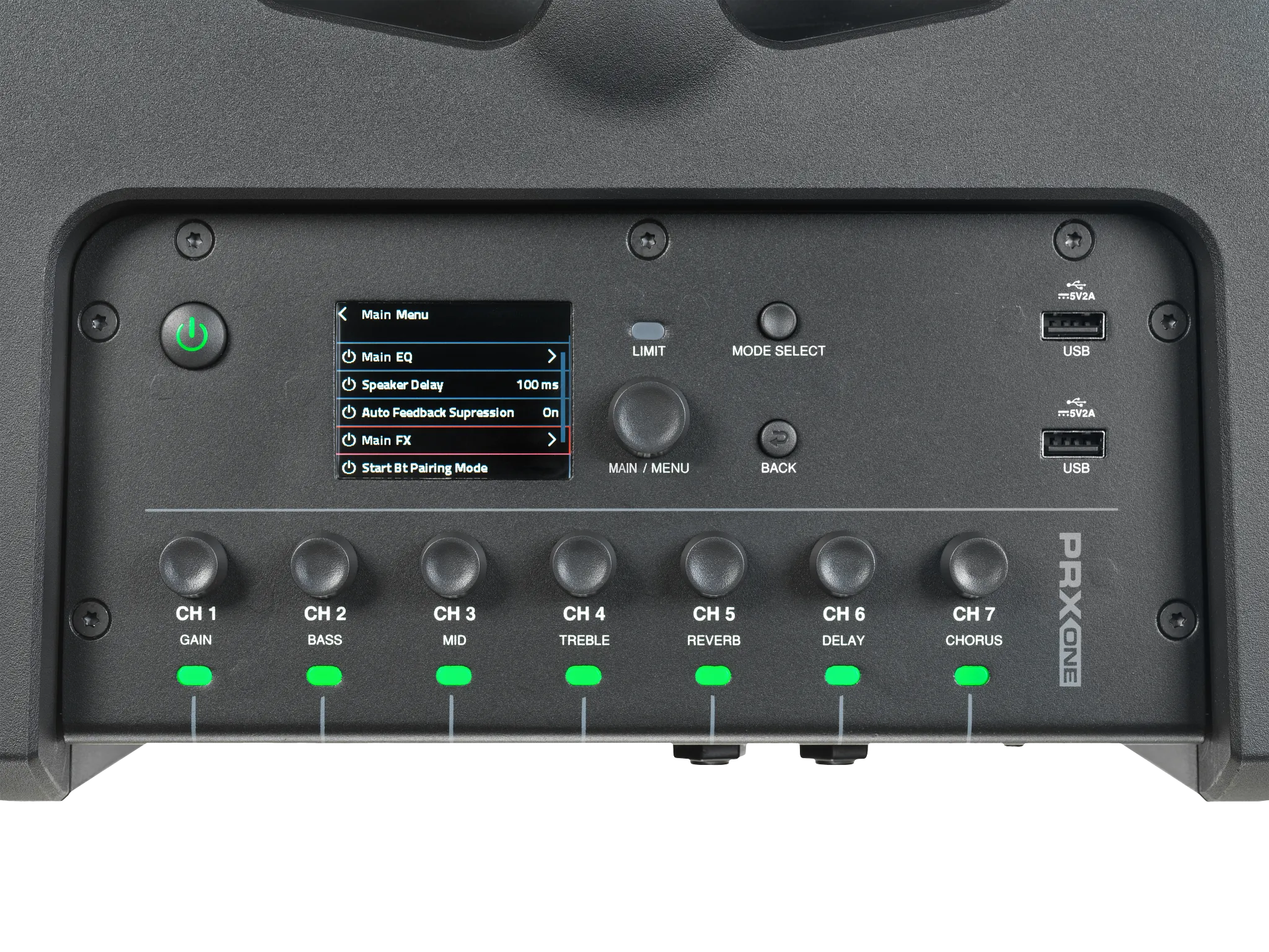 В системе есть микрофонные предусилители 56 дБ с низким уровнем шума, 4 входа XLR Combo (2 из них Hi-Z), дополнительный вход 1/8” jack и BT Audio. Встроенный DriveRack расширяет возможности.