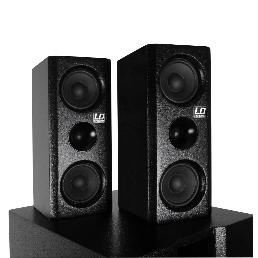 Встроенный усилитель класса AB и защита от перегрузки. Есть линейные входы XLR и RCA. На сабвуфере — регулятор громкости.