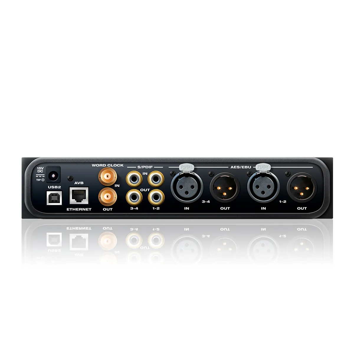 - Особенности: звуковой интерфейс под шину USB 2.0, поддержка оборудования iOS и USB 3.0, цифровые интерфейсы AES3 и S/PDIF I (четыре канала), выход стерео на наушники, AVB — сетевой интерфейс, выход/вход Word Clock под синхронизацию, интегрирован DSP-процессор