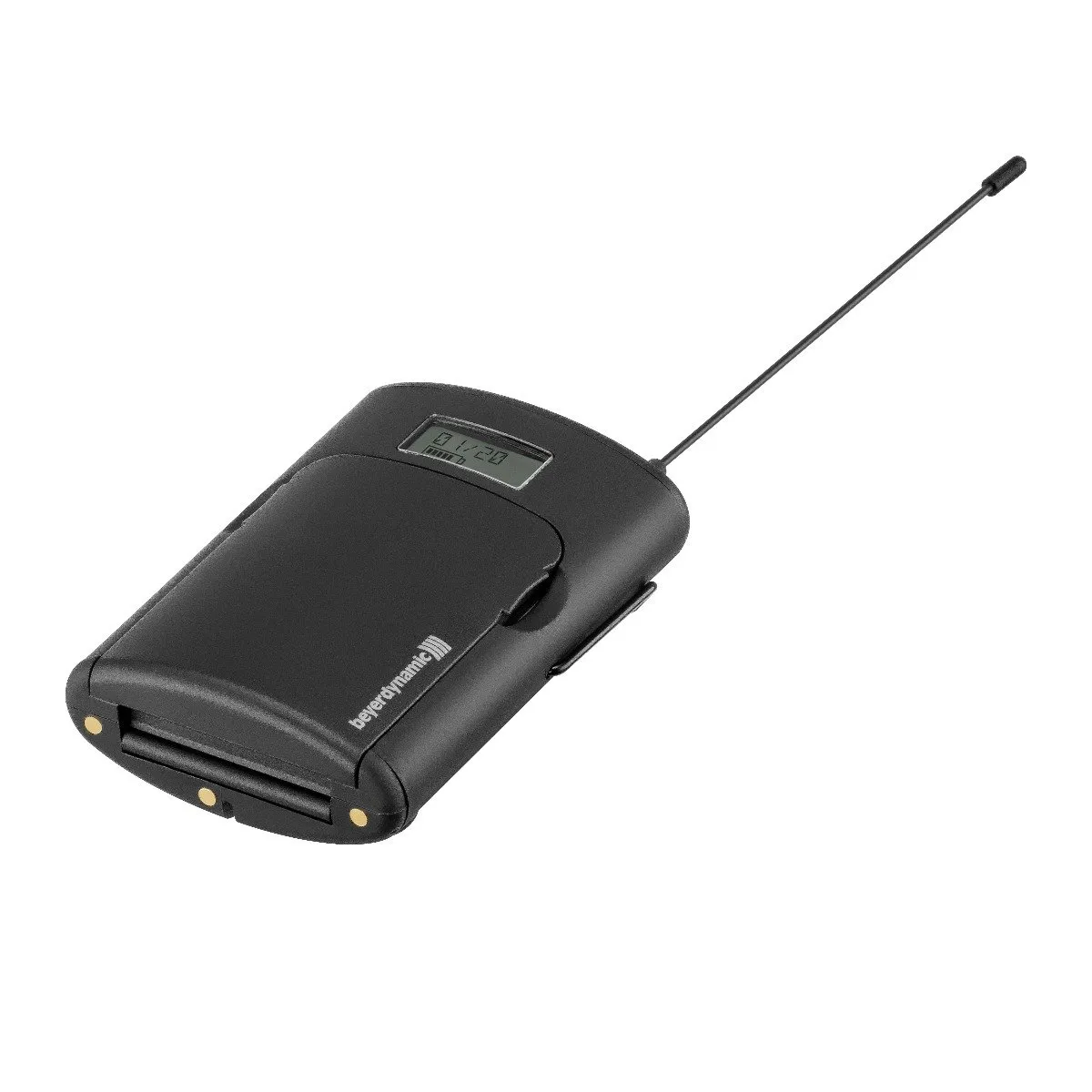Поясной передатчик Beyerdynamic TG 500B (606-636MHz) весит 85 г. без батареек. Синхронизируется с приёмниками по инфракрасу. Есть ЖК-дисплей и кнопка отключения звука. Работает до 10 часов.