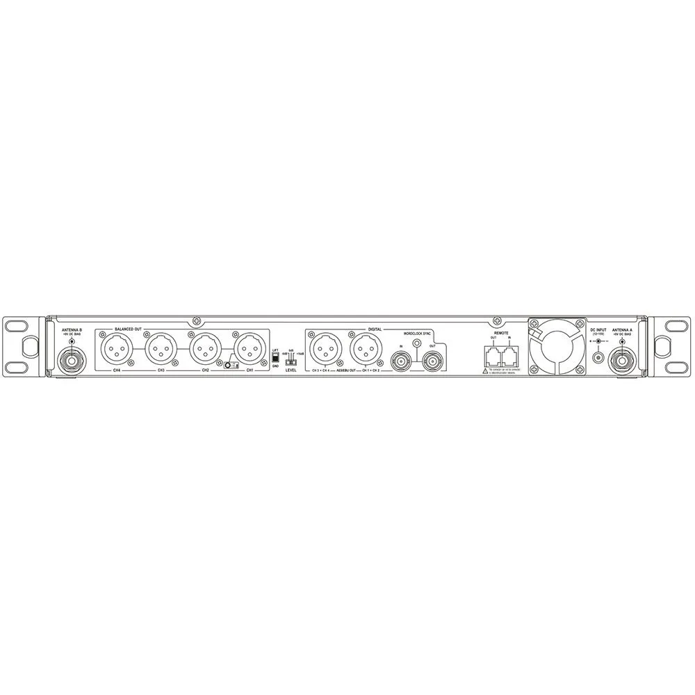 На задней панели расположены разъёмы XLR, цифровые выходы AES/EBU, вход и выход RJ11, разъёмы BNC для Wordclock и антенн.