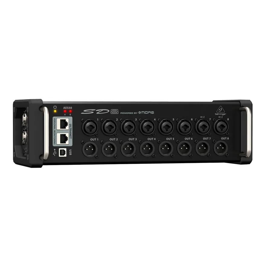 Behringer SD8 — стейджбокс с 8 входами и 8 выходами для цифровых микшеров. Включает 8 программируемых микрофонных предусилителей MIDAS, 8 аналоговых XLR выходов. Поддерживает каскадирование через AES50 и подключение микшера персонального мониторинга через Ultranet. Позволяет работать удалённо через Cat5e до 100 м. Есть USB для обновления системы.