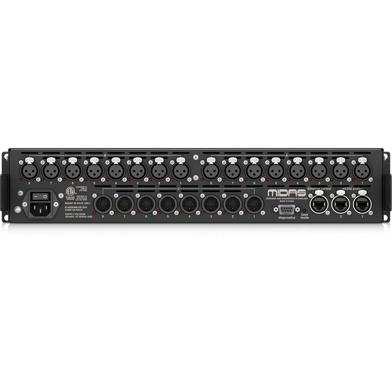 MIDAS DL153 — это аудиоинтерфейс с 16 дистанционно управляемыми микрофонными предусилителями. Предусилители работают от фантомного питания +48 В. Предусмотрена регулировка усиления от -2,5 до +45 дБ с шагом в 2,5 дБ. Частота семплирования — 96/48 кГц. Входные/выходные терминалы оснащены балансными XLR-разъёмами. На задней панели — 8 линейных аудиовыходов. Двойные сетевые порты AES50 от Neutrik со светодиодной индикацией. Устройство можно установить в рэковую стойку 2U.