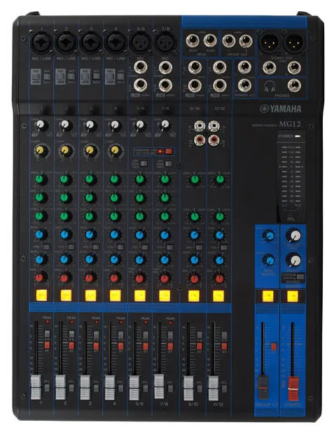 Yamaha MG12 — 12-канальный микшерный пульт с высококачественными преампами D-PRE. Имеет 6 микрофонных и 12 линейных входов, 2 групповые и 1 стереошина, 2 шины AUX. Оснащён микрофонными предусилителями, компрессорами и аттенюатором. Размеры: 308 мм x 118 мм x 422 мм. Вес: 4 кг.