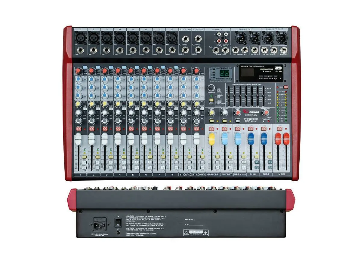 Микшерный пульт Volta ARTIST 824 — это профессиональное устройство для звукоусиления. Он оснащён 8 монофоническими линейно-микрофонными входами и 2 входными стереопарами. Каждый канал имеет 3-полосный эквалайзер, посыл на встроенный эффект, панораму и pre/post AUX.