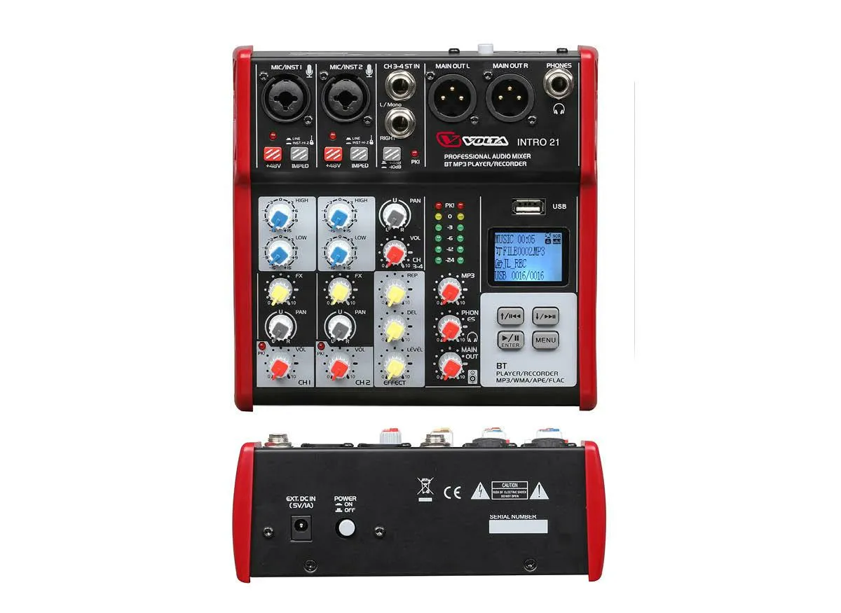 Volta INTRO 21 — компактный микшерный пульт для небольших звукоусилительных систем. Имеет 2 микрофонно-линейных входа и 1 стереофонический линейный вход. Поддерживает USB-Flash и Bluetooth для воспроизведения аудиофайлов. Может использоваться как рекордер. Балансные выходы XLR улучшают характеристики.