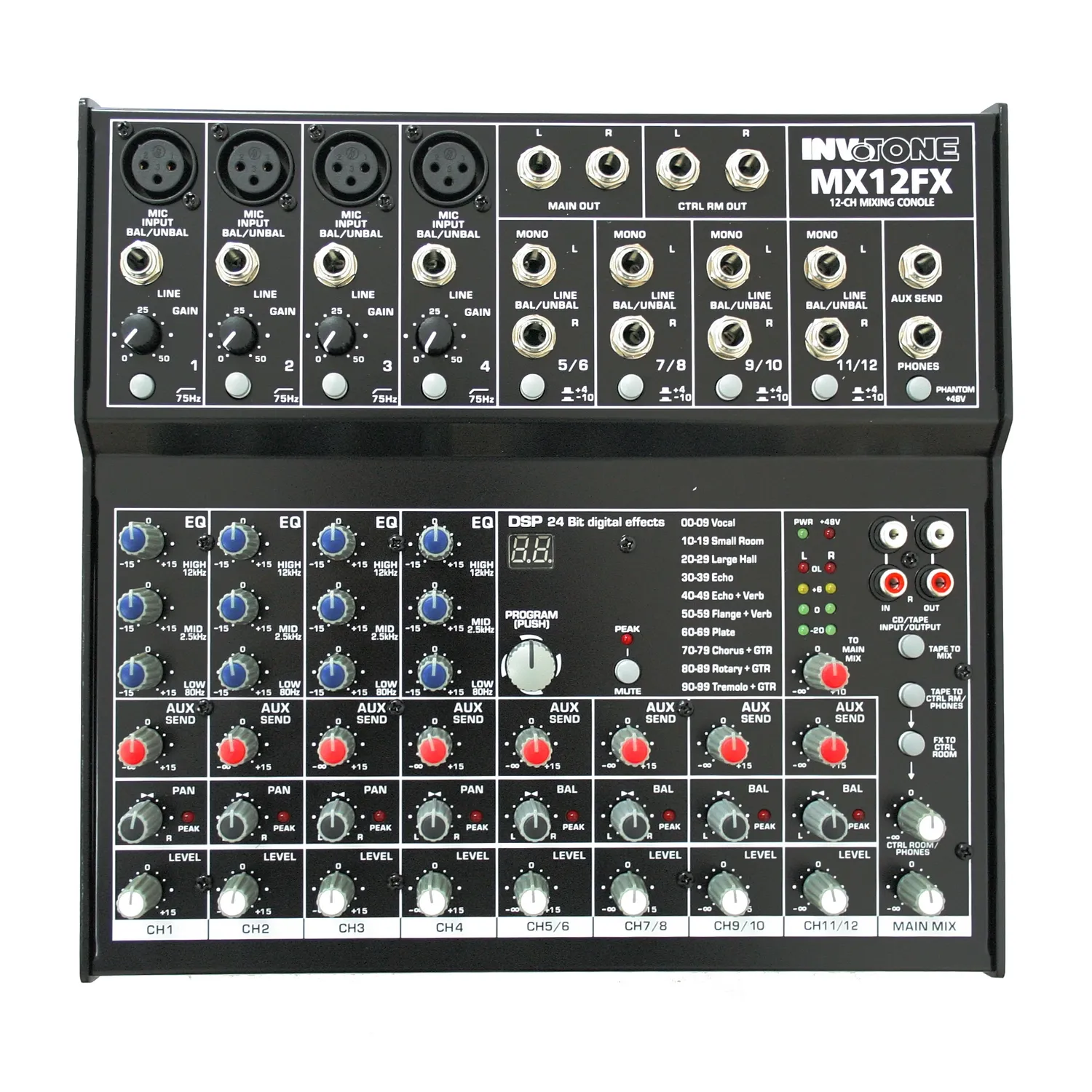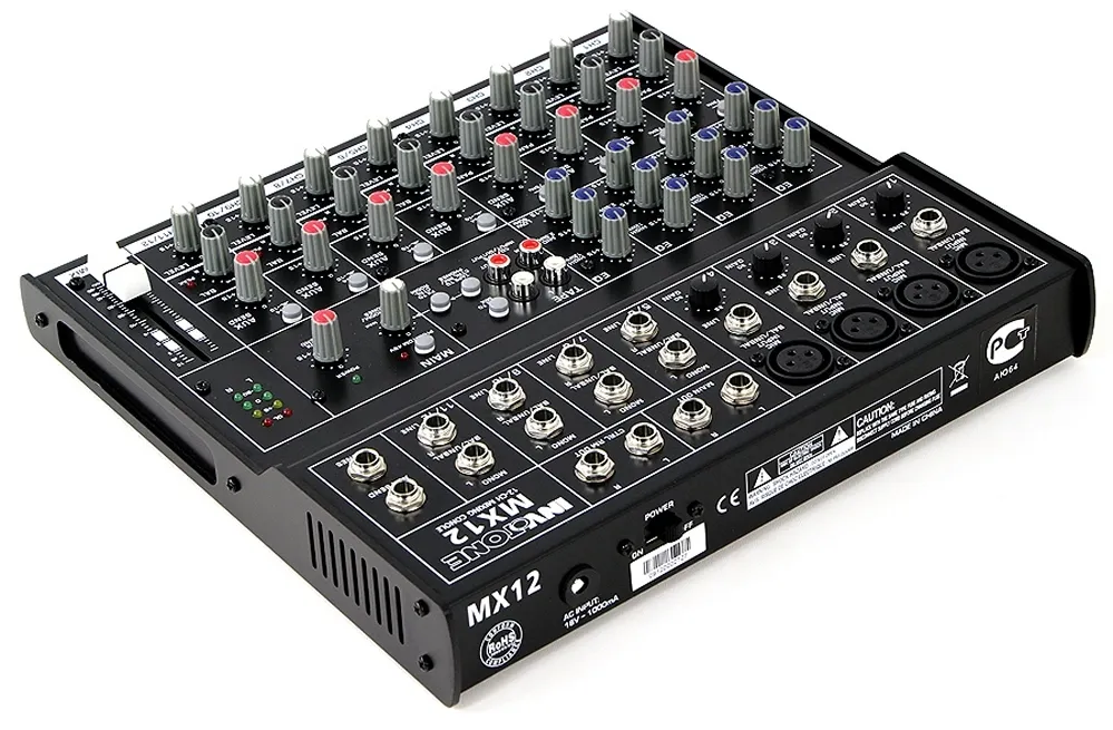 Invotone MX12FX — компактный микшерный пульт с прочной конструкцией. Имеет 4 микрофонных входа XLR и 4 стерео входа TRS. Оснащён регуляторами GAIN, фантомным питанием +48В, трёхполосными эквалайзерами и НЧ-фильтром 75 Гц. Есть POST-фейдерный вспомогательный отбор сигнала AUX. Встроенный цифровой 24-bit процессор эффектов.