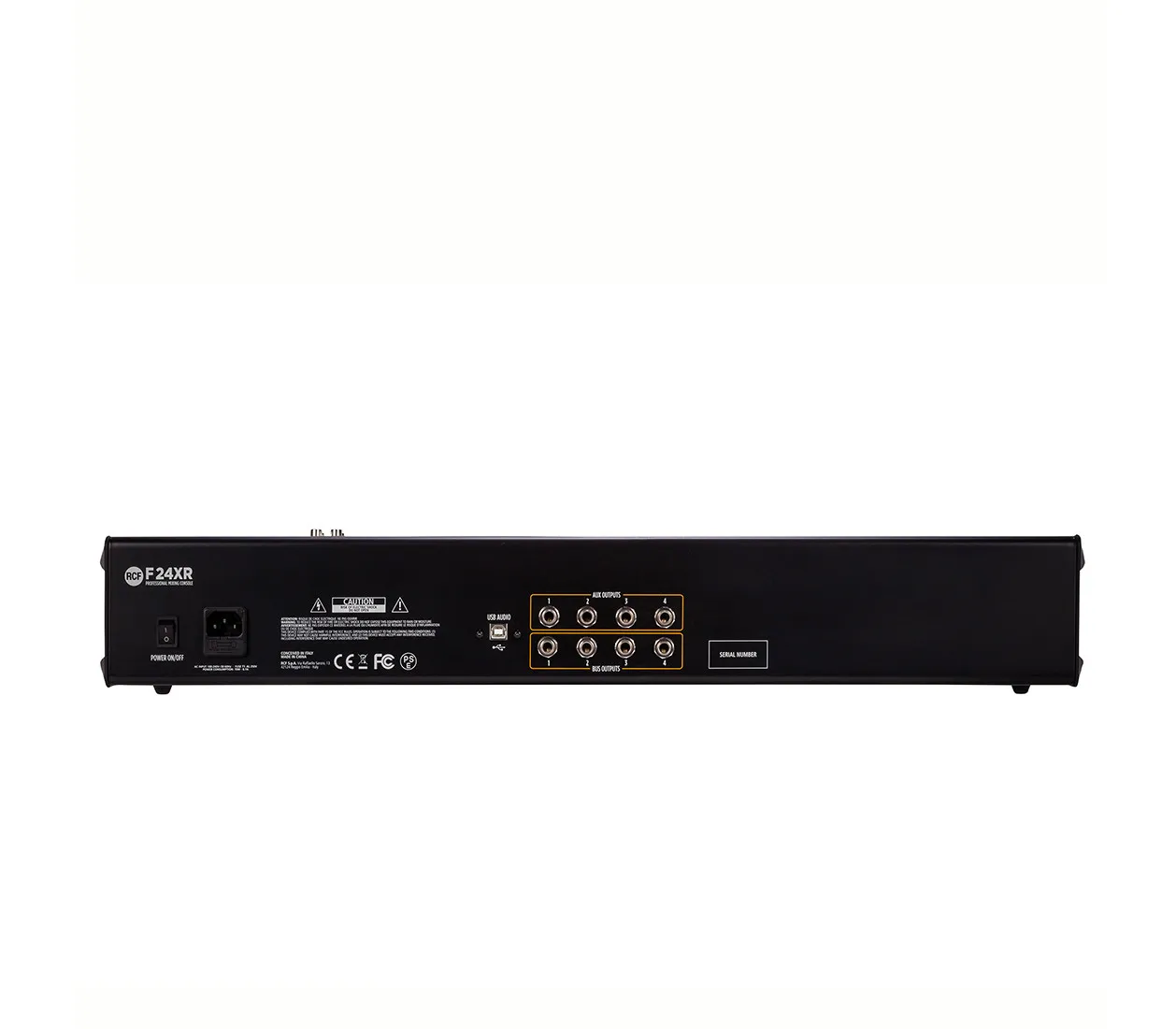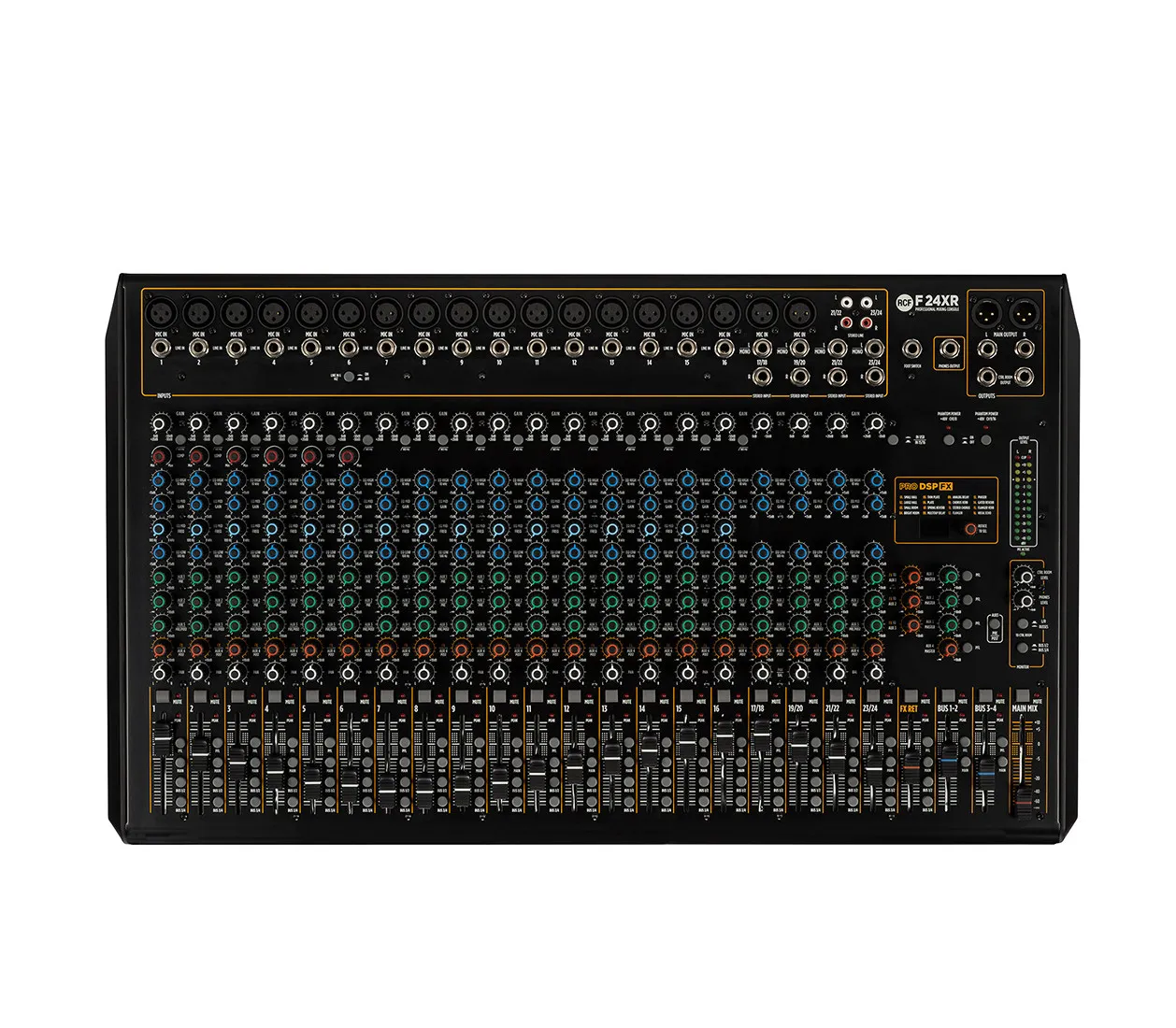 Микшерный пульт RCF F 24XR — профессиональное устройство с 18 микрофонными входами, 16 линейными моно и 4 линейными стерео входами. Оснащён мульти-FX, 6 компрессорами, стереозаписью и воспроизведением через USB. Имеет 3-полосный эквалайзер для моноканалов и 3-полосный для стереоканалов. 16 внутренних пресета PRO DSP, 2 выходные шины и 4 разъёма Aux. Прочный металлический корпус, разработанный в Италии.