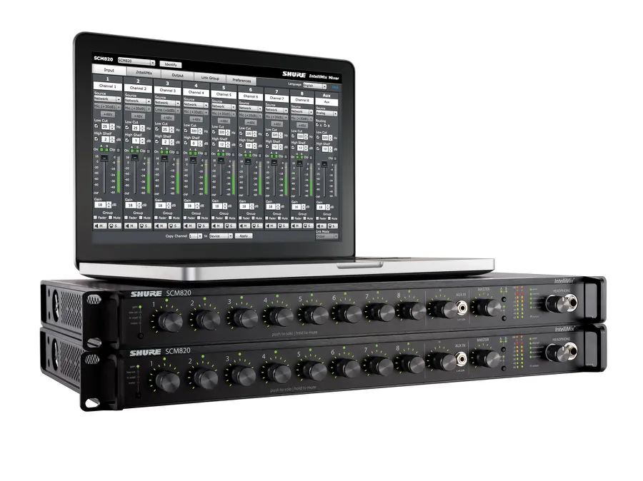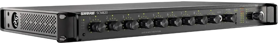 SHURE SCM820E-DAN — это профессиональный восьмиканальный микшер. Он оснащён технологией Dante для быстрой синхронизации через Ethernet и Dante Virtual Soundcard для записи звука на компьютер.
