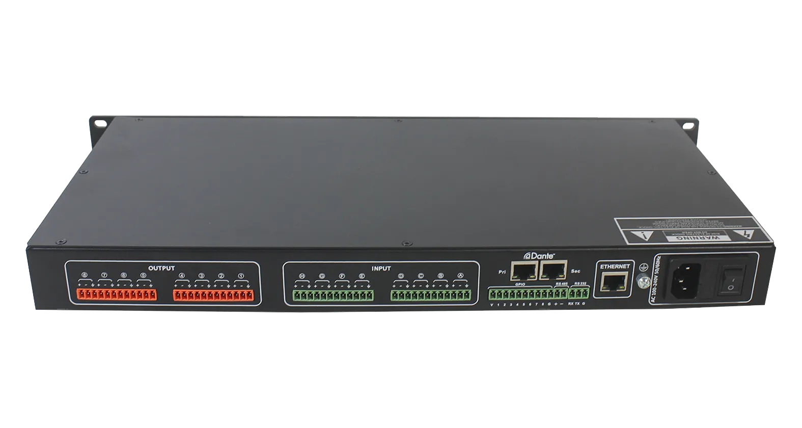 Основные параметры: 8 каналов микрофона и линейного входа, 8 каналов линейного выхода, 2 порта Gigabit Ethernet, 8 каналов GPIO и 1 последовательный порт RS232.