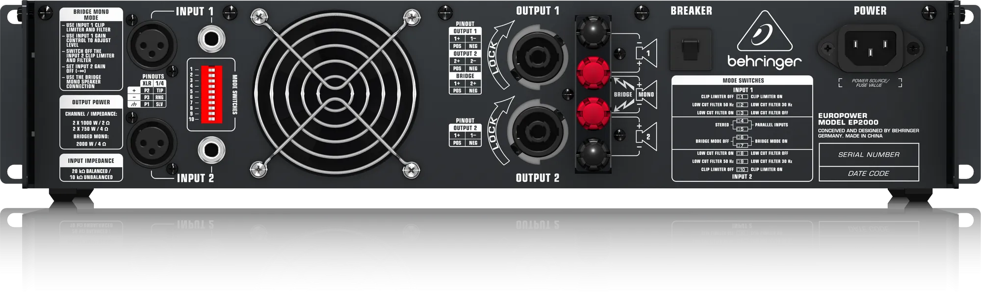 Behringer EP2000 — мощный усилитель с технологией ATR. Обеспечивает 2 х 1000 Вт в стереорежиме и 2000 Вт в мостовом. Есть светодиодные индикаторы мощности, сигнала и перегрузки. Входные разъёмы XLR и 1/4" TRS. Выходы — профессиональные SPEAKON. Защищён от перегрева и перегрузок. Разработан в Германии.