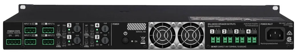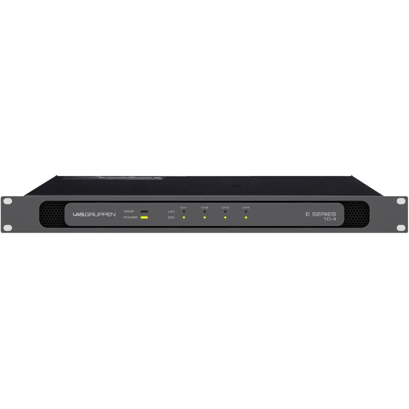 Lab.gruppen E 10:4 — 4-канальный усилитель с распределением мощности 4x250 Вт. Поддерживает импедансы 2/4/8/16 Ом и системы 70В/100В. Мощность потребления — 500 Вт. Есть GPIO.