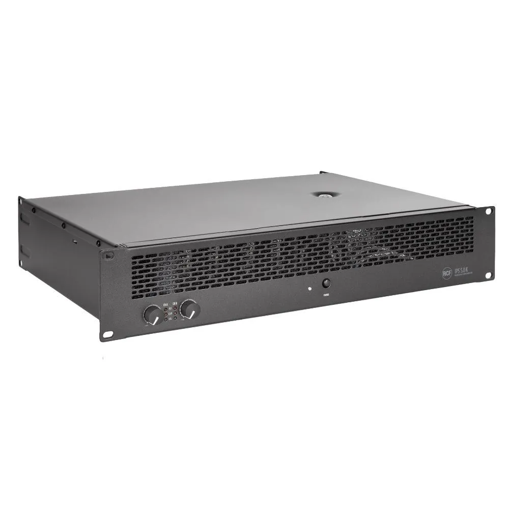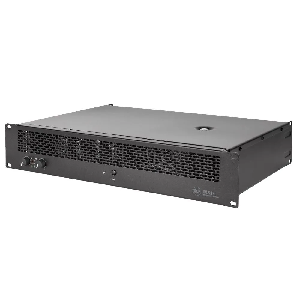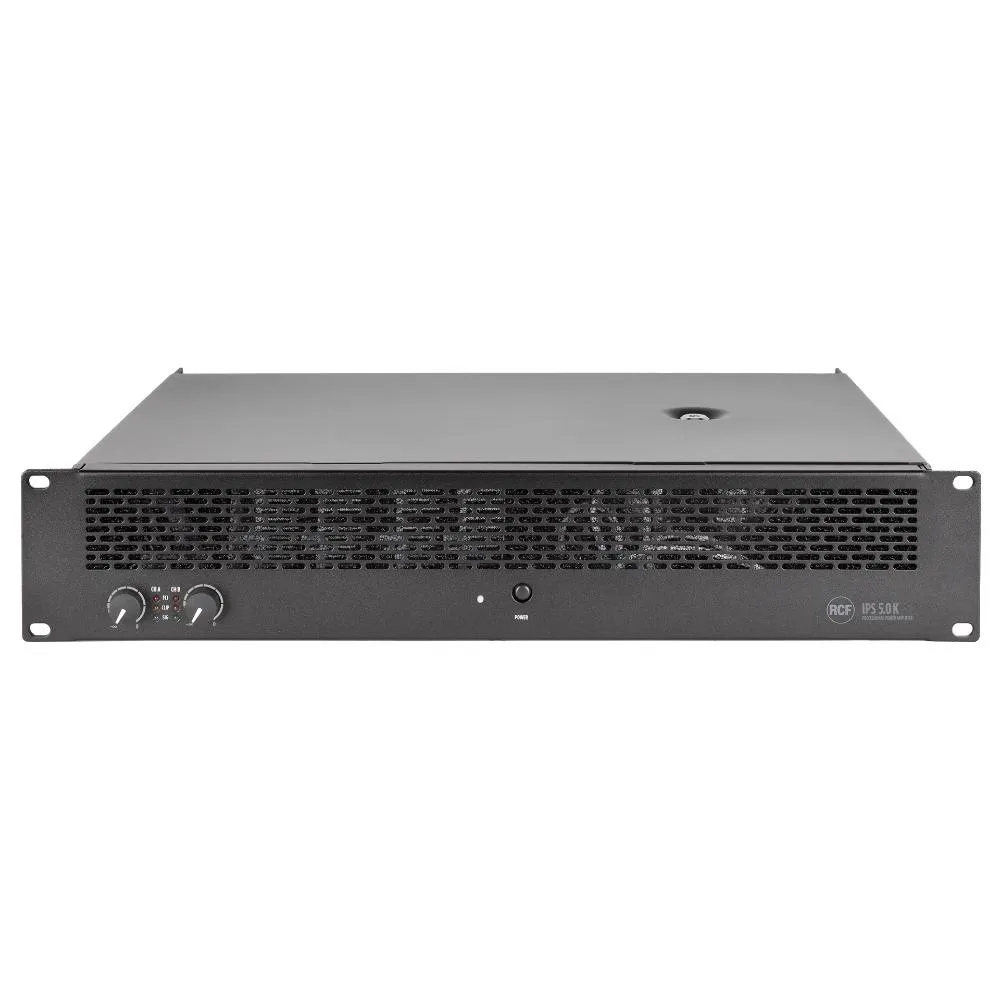 RCF IPS 5.0K — двухканальный усилитель мощности класса H. Выдает до 2 х 2600 Вт при сопротивлении 4 Ом. Оснащен регулировкой усиления, индикаторами сигнала, клипа и неисправностей. Имеет стерео XLR входы и выходы, переключатели режимов работы, систему защиты от короткого замыкания и перегрева.