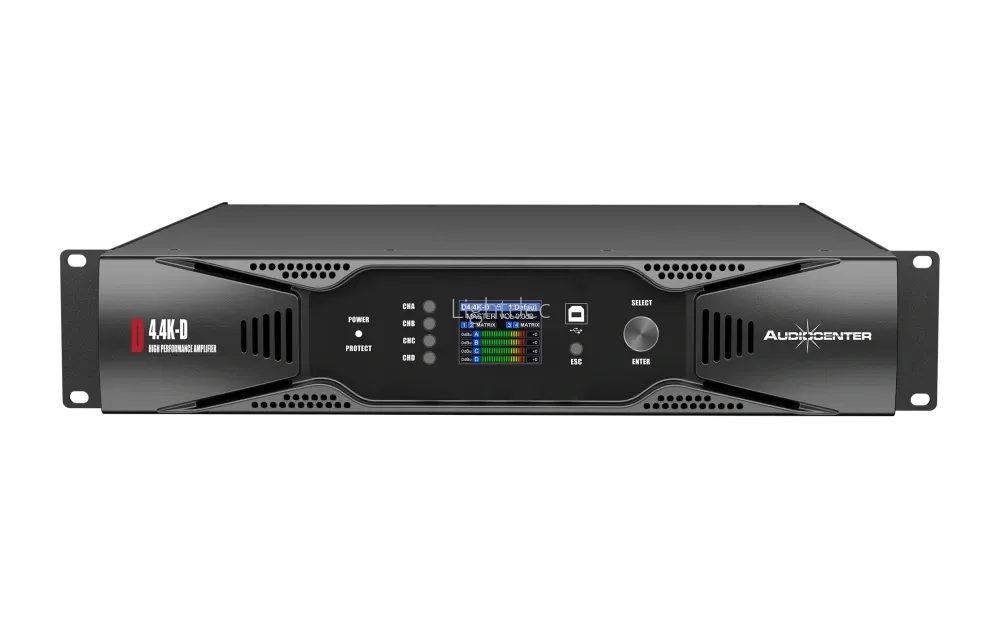 Audiocenter D4.4K-D — четырёхканальный цифровой усилитель с технологией D и DSP. Оснащён фильтрами IIR и FIR. Поддерживает настройку через USB, дисплей на передней панели и Ethernet. Идеален для профессиональных аудиосистем.